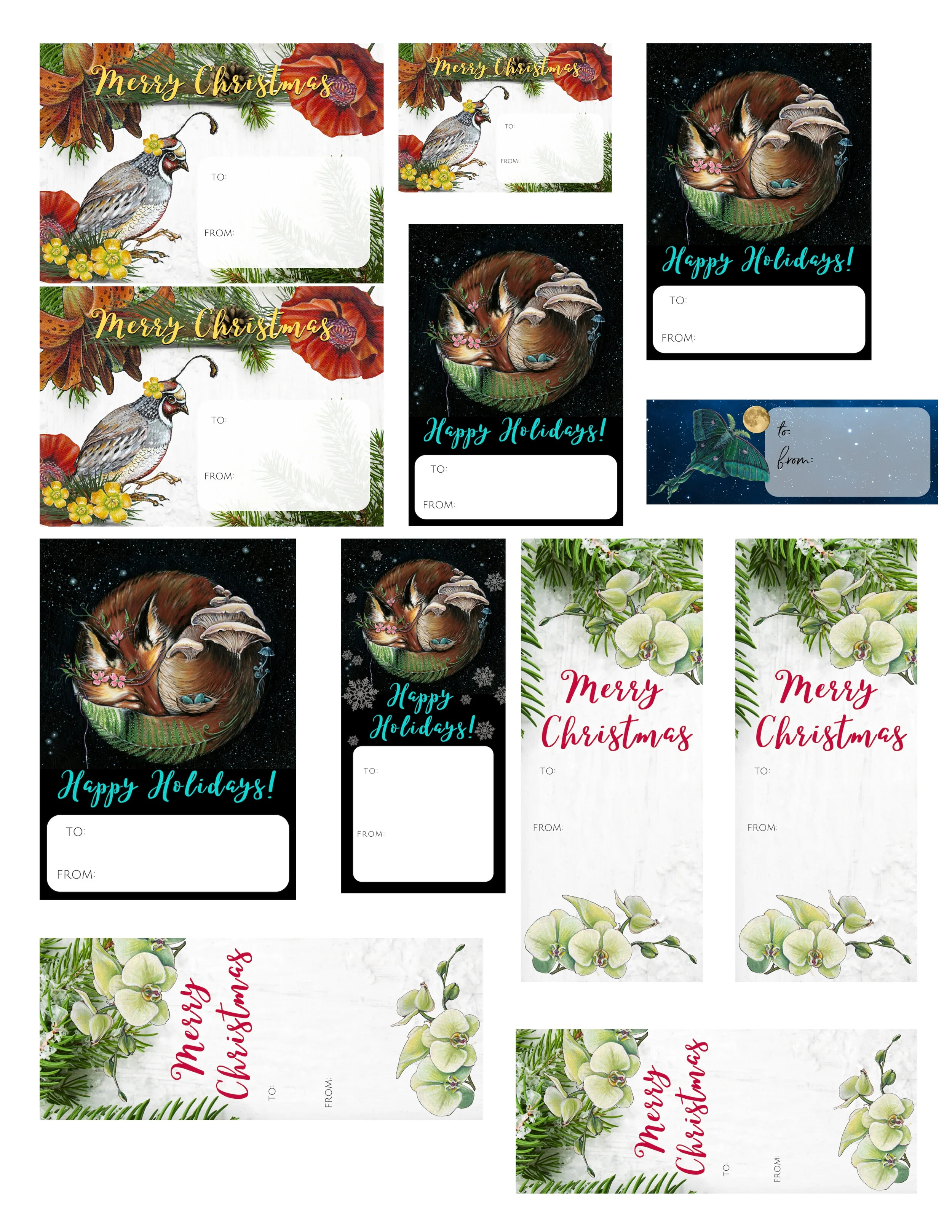 Each page has several designs and sizes. Simply download, print, then cut. A hole punch makes for an easy tie on option or print on sticker paper.